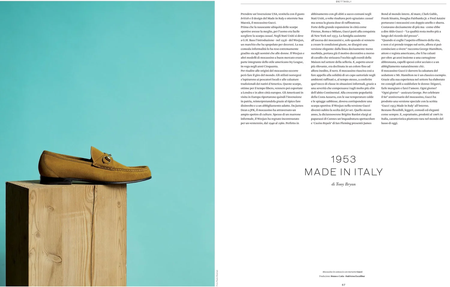 To celebrate the sixtieth anniversary of their loafer, Gucci has released a special anniversary edition. With “Gucci 1953 Made in Italy” stamped inside, they continue to be as pliable, light, comfortable and elegant as they ever were. And they continue to be 100% made in Italy, a rare exception in today’s luxury world. As Aldo said, the quality will be long remembered, and indeed it already has. The Gucci loafer may be in the permanent collection of the Metropolitan Museum of Art but after kicking around for sixty years they are still the perfect kicks of the confident hedonist. Just ask George.